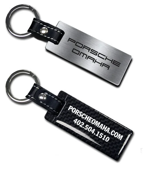 Your Porsche dealership graphics are available on one or both sides of the keychain using a permanent black laser etching process, or full color screen print with a clear protective dome.
