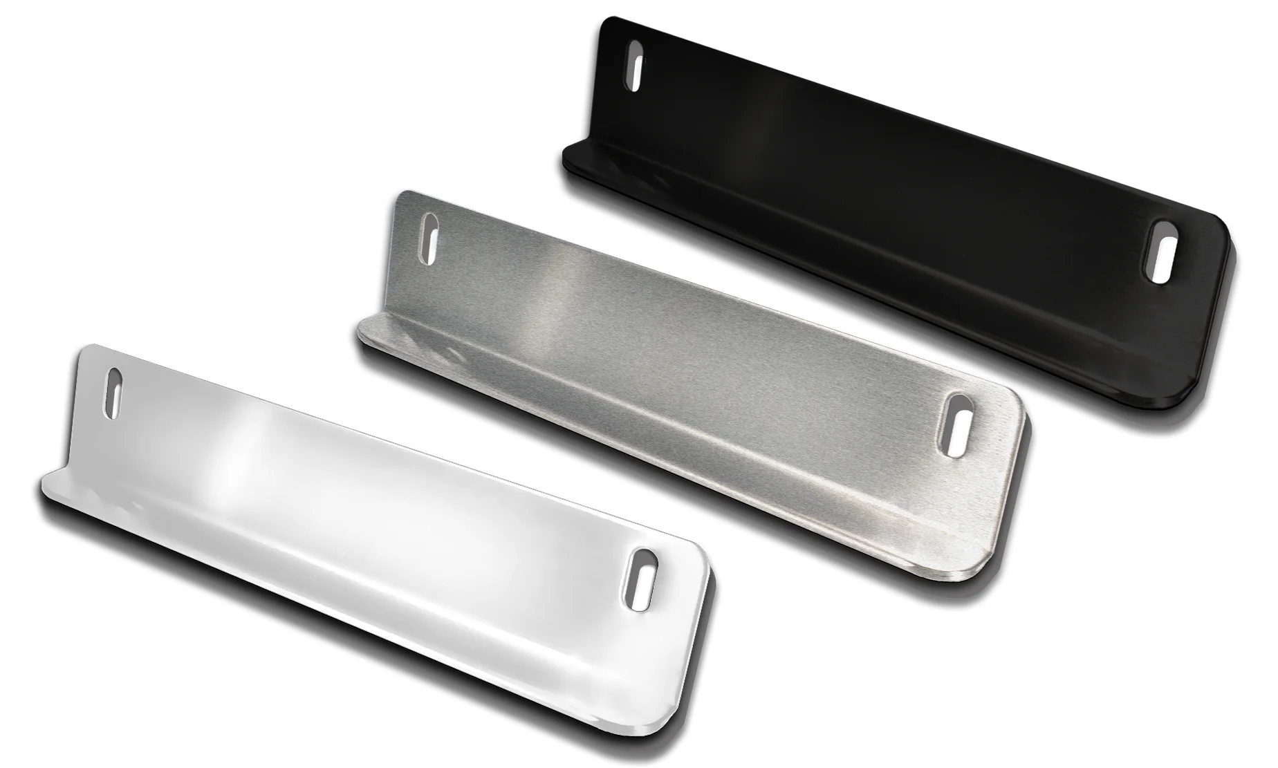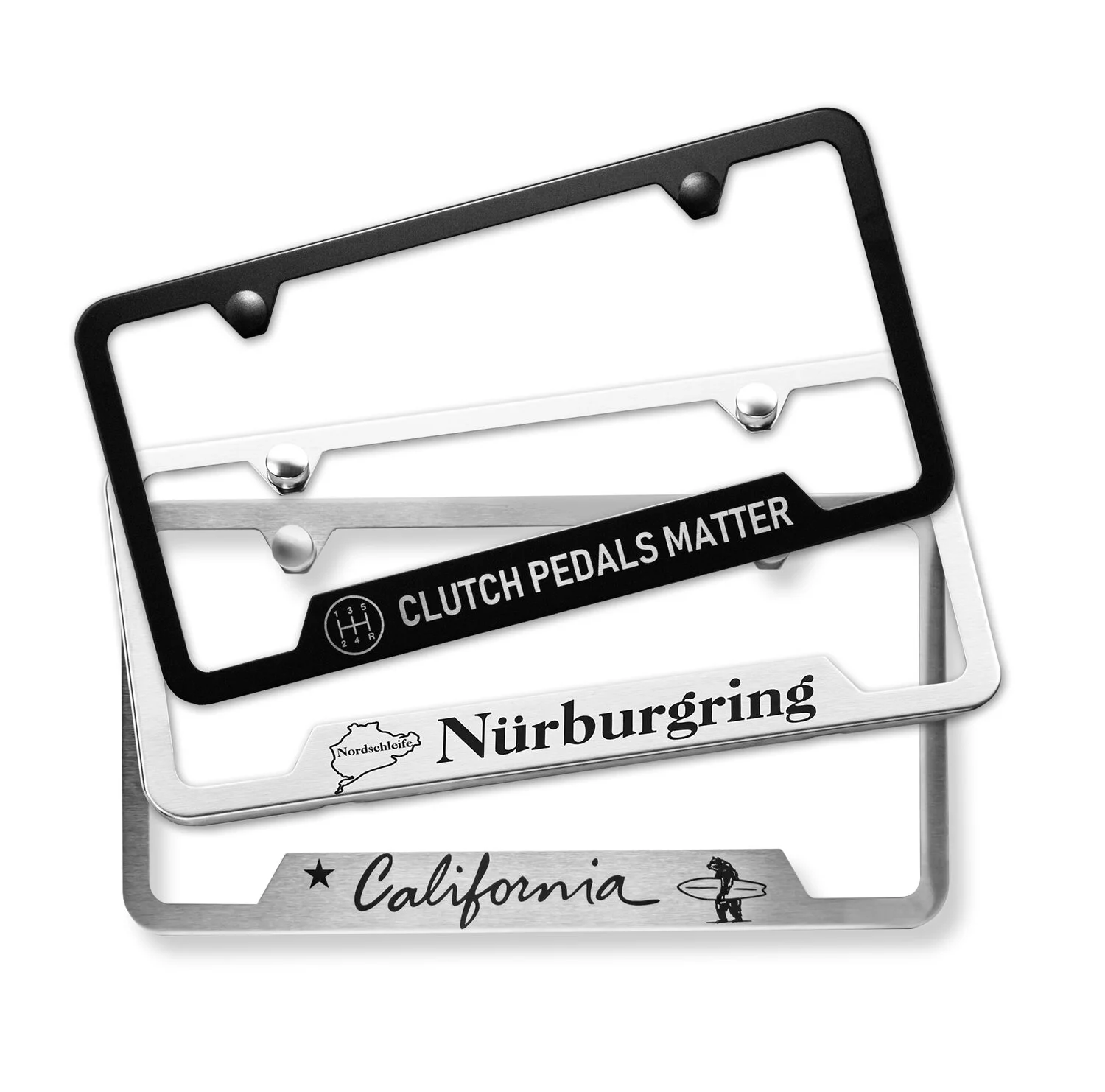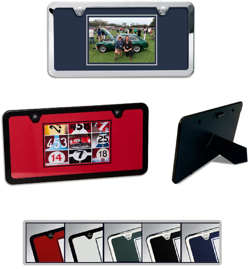 Available in four different finishes - Polished, Brushed, Black Powder Coated and Black Pearl - in frame styles that do not block DMV registration tags in all 50 states.